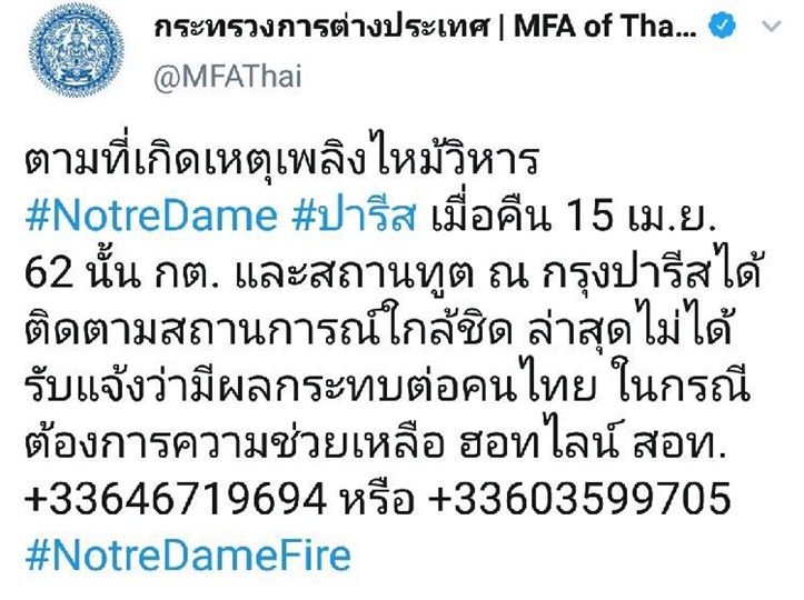 ภายหลังสื่อต่างประเทศรายงานว่า เกิดเหตุเพลิงไหม้ที่ มหาวิหารนอเทรอดาม ใจกลางกรุงปารีสของฝรั่งเศส เมื่อช่วงเย็นของวันที่ 15 เมษายน ตามเวลาท้องถิ่น กระทรวงการต่างประเทศของไทย แจ้งว่า สถานเอกอัครราชทูตไทย ณ กรุงปารีส ประเทศฝรั่งเศส ได้ติดตามสถานการณ์อย่างใกล้ชิด และยังไม่ได้รับแจ้งว่ามีคนไทยได้รับผลกระทบจากเหตุเพลิงครั้งนี้ และในกรณีต้องการความช่วยเหลือ ติดต่อได้ที่ ฮอทไลน์ สอท. +33646719694 หรือ +33603599705.-สำนักข่าวไทย