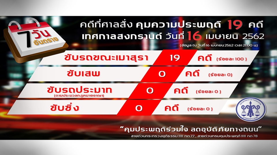 สำหรับยอดสะสมสถิติคดีที่ศาลสั่งคุมประพฤติระหว่างวันที่ 11-16 เม.ย.2562 มีจำนวนทั้งสิ้น 8,642 คดี จำแนกเป็นคดีขับรถขณะเมาสุรา จำนวน 8,481 คดี คิดเป็นร้อยละ 98.14 คดีขับเสพ จำนวน 150 คดี คิดเป็นร้อยละ 1.73 คดีขับรถประมาท จำนวน 11 คดี คิดเป็นร้อยละ 0.13 โดยจังหวัดที่มีสถิติคดีขับรถขณะเมาสุราสะสมสูงสุด 3 อันดับ ได้แก่ จังหวัดมหาสารคาม จำนวน 596 คดี กรุงเทพมหานคร จำนวน 480 คดี และจังหวัดนครพนม จำนวน 440 คดี