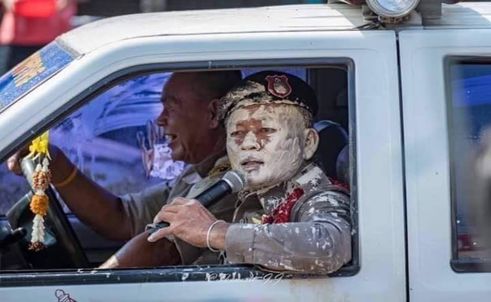 ด้าน ร.ต.ต.ธรรศกร เปิดใจกับผู้สื่อข่าวว่า ในครั้งแรกที่ทางประชาชน และชาวบ้าน ที่เดินทางมาเล่นสงกรานต์ในพื้นที่ตลาดลำนารายณ์ แล้วมาขอปะแป้ง ตนเองก็ถือว่าชาวบ้านรักและเคารพเราจึงให้ประแป้ง เนื่องจากจังหวัดลพบุรีมีคำขวัญว่า “วังนารายณ์คู่บ้าน ศาลพระกาฬคู่เมือง ปรางค์สามยอดลือเรื่อง เมืองแห่งดินสอพอง เขื่อนป่าสักชลสิทธิ์เกริกก้อง แผ่นดินทองสมเด็จพระนารายณ์” และจังหวัดลพบุรีถือเป็นจังหวัดที่มีการผลิตดินสอพองแหล่งใหญ่ที่สุดของประเทศ จึงไม่แปลกที่คนลพบุรีจะเล่นแป้งดินสอพอง