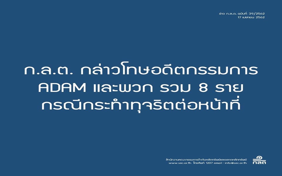 สำหรับการกระทำของอดีตกรรมการ ADAM และพวกรวม 8 ราย เข้าข่ายเป็นความผิดตามกฎหมาย ก.ล.ต.จึงกล่าวโทษบุคคลทั้ง 8 ราย ต่อกรมสอบสวนคดีพิเศษ (ดีเอสไอ) เพื่อพิจารณาดำเนินการตามกฎหมาย ทำให้ผู้ถูกกล่าวโทษเข้าข่ายมีลักษณะขาดความน่าไว้วางใจในการเป็นกรรมการและผู้บริหารของบริษัทที่ออกหลักทรัพย์และบริษัทจดทะเบียน ตามประกาศ ก.ล.ต. จึงไม่สามารถเป็นกรรมการและผู้บริหารของบริษัทที่มีหลักทรัพย์จดทะเบียนตลอดระยะเวลาที่ถูกกล่าวโทษดำเนินคดี.-สำนักข่าวไทย