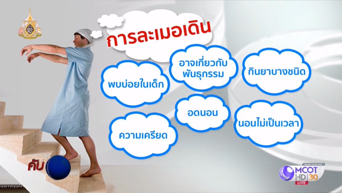 กทม. 17 เม.ย.-แพทย์แจงอาการละเมอเดินมักเกิดช่วงครึ่งแรกของการนอน พบบ่อยในเด็ก ป้องกันโดยนอนให้เพียงพอ ไม่อดนอน เข้านอน-ตื่นนอน เป็นเวลา ผู้ที่อยู่ด้วยขณะละเมอ ไม่ควรปลุกหรือขัดขวางสิ่งที่ผู้ละเมอทำอยู่