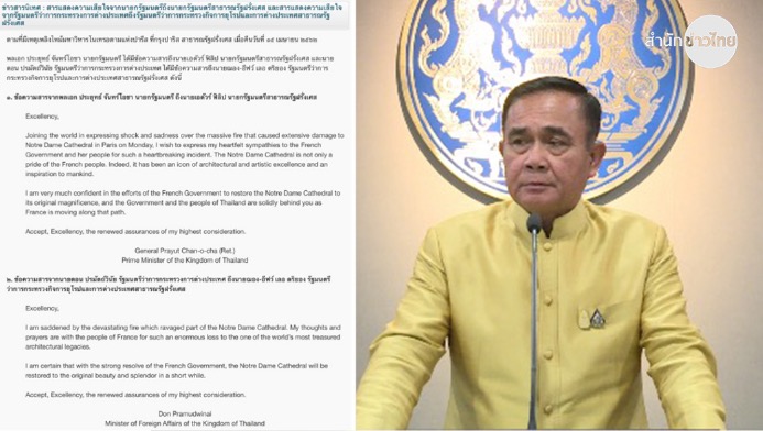 ตามที่มีเหตุเพลิงไหม้ มหาวิหารนอเทรอดามแห่งปารีส ประเทศฝรั่งเศส เมื่อคืนวันที่ 15 เมษายนที่ผ่านมา ล่าสุด พล.อ.ประยุทธ์ จันทร์โอชา นายกรัฐมนตรี ได้มีข้อความสารถึงนายเอดัวร์ ฟิลิป นายกรัฐมนตรีฝรั่งเศส แสดงความเสียใจกับเหตุการณ์ที่เกิดขึ้น