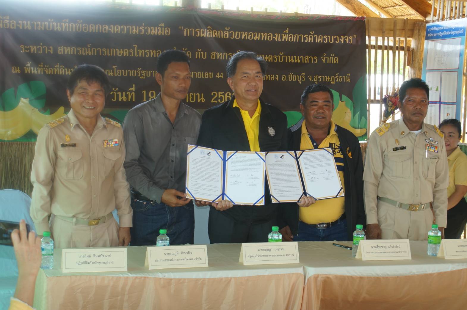 “ การพัฒนานั้นจะให้เกษตรกรรวมแปลง จัดตั้งสหกรณ์เช่าที่ดิน ส.ป.ก. นำมาจัดสรรให้เกษตรกรทำกิน ไม่ได้เป็นเอกสารสิทธิ แล้วนำนโยบายรัฐมนตรีเกษตรฯ ให้ทำเกษตรพันธสัญญา (Contract Farming) กับสหกรณ์บ้านนาสารปลูกกล้วยหอมทอง 50,000 หน่อต่อปีเพื่อให้ได้ผลผลิตคุณภาพส่งออกในพื้นที่ 125 ไร่จะมีรายได้ 40กว่าล้านบาทต่อปี รับซื้อประกันราคา 13.50 กก.ซี่งสหกรณ์บ้านนาสารจะเข้ามาดูแลเป็นพี่เลี้ยงให้ได้ผลผลิตที่ดีตรงตามตลาดต้องการ ตั้งแต่ปลูก แล้วให้ผลใน 8-10 เดือน โดยเฉลี่ยแล้วเกษตรกรจะขายผลผลิตได้ 41,000 บาทต่อไร่ต่อปี นอกจากนี้สหกรณ์จะปลูกพืชอื่นเสริมตามที่ตลาดต้องการ เบื้องต้นมีเกษตรกรลงนามร่วมผลิตมะละกอฮอลแลนด์แปลงใหญ่ส่งโรงแรม โรงพยาบาล และห้างร้าน ซึ่งจะขยายผลตามนโยบายนี้ไปในพื้นที่ ส.ป.ก. ทั่วประเทศ” นายวิณะโรจน์กล่าว