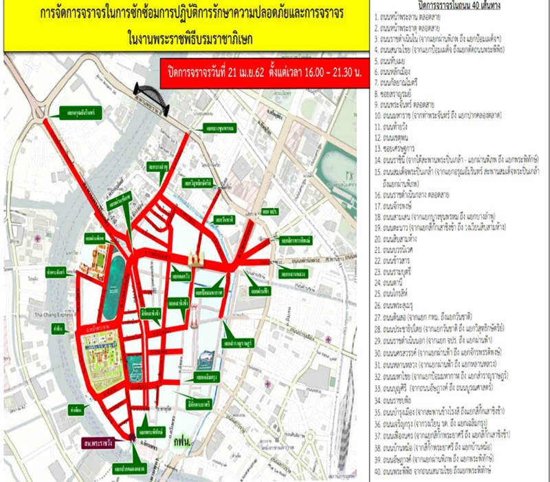 กรุงเทพฯ 19 เม.ย.- บช.น. แจ้งปิดการจราจร 40 เส้นทาง เพื่อซักซ้อมงานพระราชพิธีฯ วันที่ 21 เม.ย.2562”