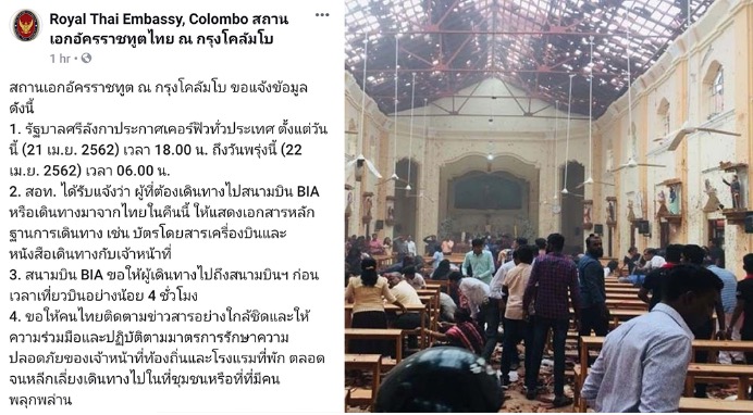 สถานเอกอัครราชทูต ณ กรุงโคลัมโบ แจ้งข้อมูล ระบุ รัฐบาลศรีลังกาประกาศเคอร์ฟิวทั่วประเทศ ตั้งแต่วันนี้ (21 เม.ย. 2562) เวลา 18.00 น. ถึงวันพรุ่งนี้ (22 เม.ย. 2562) เวลา 06.00 น. ขณะที่ สอท. ได้รับแจ้งว่า ผู้ที่ต้องเดินทางไปสนามบิน BIA หรือเดินทางมาจากไทยในคืนนี้ ให้แสดงเอกสารหลักฐานการเดินทาง เช่น บัตรโดยสารเครื่องบินและหนังสือเดินทางกับเจ้าหน้าที่