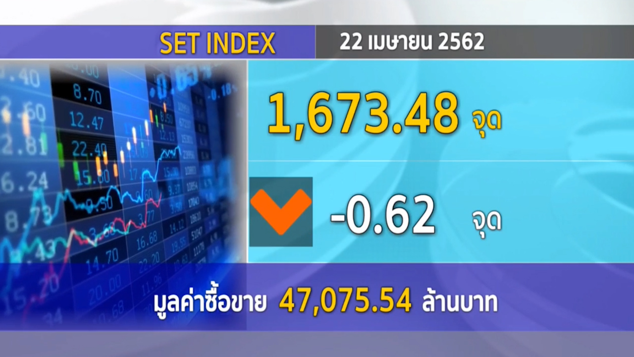 กทม. 22 เม.ย.-ดัชนีหุ้นไทยปิดลบ 0.62 จุด อยู่ที่ระดับ 1,673.48 จุด มูลค่าการซื้อขาย 47,075.54 ล้านบาท.-สำนักข่าวไทย