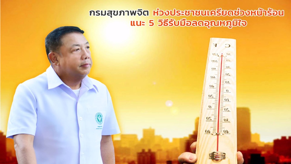 กรมสุขภาพจิต 23 เม.ย.-กรมสุขภาพจิต ห่วงประชาชนเกิดความเครียดในช่วงหน้าร้อน แนะ 5 วิธีรับมือ ‘มีสติรู้ตัวจัดการกับความเครียดได้-ไม่ปล่อยให้ร่างกายขาดน้ำ-ทานอาหารมีประโยชน์-พักผ่อนเพียงพอ-หลีก เลี่ยงการอยู่กลางแดดร้อนจัด’