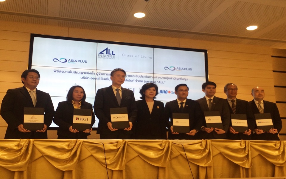 นายธนากร ธนวริทธิ์ ประธานเจ้าหน้าที่บริหาร บมจ.ออลล์ อินสไปร์ ดีเวลลอปเม้นท์ (ALL) กล่าวว่า ALL ลงนามสัญญาแต่งตั้งบริษัทหลักทรัพย์ เอเซีย พลัส จำกัด เป็นผู้จัดการการจัดจำหน่ายและรับประกันการจำหน่ายหุ้นสามัญเพิ่มทุน พร้อมทั้งแต่งตั้งบริษัทหลักทรัพย์ คันทรี่ กรุ๊ป จำกัด (มหาชน) บริษัทหลักทรัพย์ เคจีไอ (ประเทศไทย) จำกัด (มหาชน) และบริษัทหลักทรัพย์ อาร์เอชบี (ประเทศไทย) จำกัด (มหาชน) เป็นผู้ร่วมจัดจำหน่ายและรับประกันการจำหน่ายหุ้นสามัญเพิ่มทุน โดยกำหนดราคาเสนอขายหุ้นแก่ประชาชนเป็นครั้งแรก (IPO) 4.90 บาท จำนวน 150 ล้านหุ้น วันที่ 26, 29 และ 30 เมษายน 2562 คิดเป็นมูลค่าการเสนอขาย 735 ล้านบาท และคาดว่าจะเข้าซื้อขายวันแรกในตลาดหลักทรัพย์เอ็มเอไอ วันที่ 8 พฤษภาคมนี้