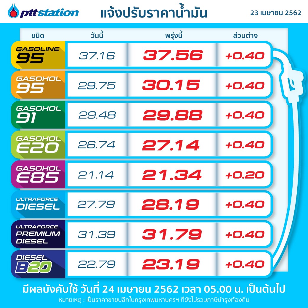 ลิตร มีผล 24 เม.ย. 2562 เวลา 05.00 น. เป็นต้นไป โดยราคาขายปลีกเป็นดังนี้ เบนซิน 95 ลิตรละ 37.56 บาท แก๊สโซฮอล์ 95 ลิตรละ 30.15 บาท E20 ลิตรละ 27.14 บาท แก๊สโซฮอล์ 91 ลิตรละ