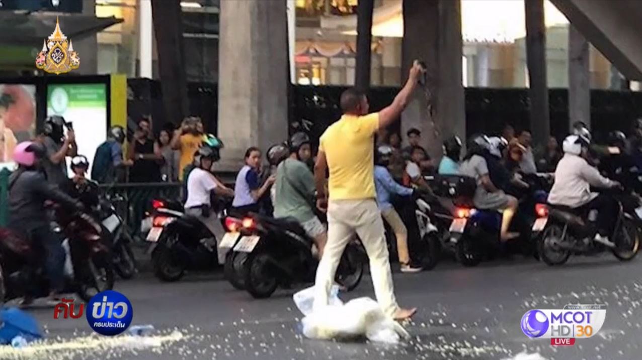 เมื่อช่วงเย็นที่ผ่านมา บริเวณถนนราชดำริ หน้าศูนย์การค้าเซ็นทรัลเวิลด์ ได้เกิดเหตุวุ่นวายขึ้น เมื่อมีชายอายุประมาณ 50 ปี ขับรถหรูยี่ห้อเบนซ์ สีดำ ป้ายแดง ไปจอดกลาง ก่อนเทงูลงบนถนนหลายตัว จากนั้นได้ชูมีดโบกสะบัดไปมา และทำท่าเหมือนสับไปที่ตัวเองคล้ายจะทำร้ายตัวเอง พร้อมกับชูถุงใส่งูไปด้วย สร้างความแตกตื่นให้แก่ผู้พบเห็นเป็นอย่างมาก เนื่องจากเป็นเวลาหลังเลิกงาน และมีผู้ที่ดูเหตุการณ์บนสะพานลอยจำนวนมาก