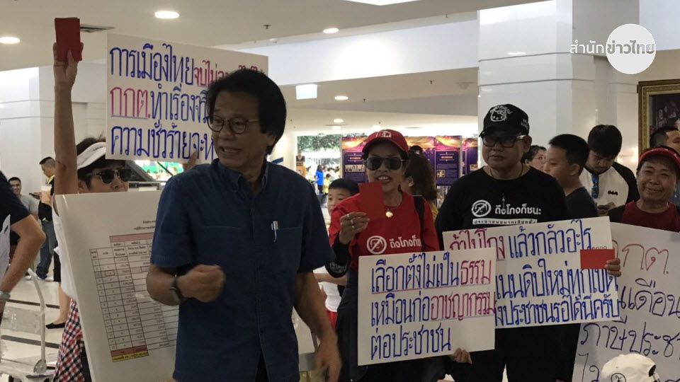 จากนั้น นพ.ทศพร นายเอกชัย นายอนุรักษ์ และมวลชน ได้ร่วมกันจัดกิจกรรมเชิงสัญลักษณ์ มอบใบแดงและใบสั่งให้กับ กกต. โดยมีการชูป้ายข้อความ “การเมืองไทยจบไม่ลง จบไม่ได้ กกต.ต้องทำเรื่องจริงให้ปรากฏ ความชั่วร้ายจะหายไป” “ถ้าไม่โกงแล้วกลัวอะไร นับคะแนนดิบใหม่ทุกเขตเลือกตั้ง ประชาชนรอได้นี่ครับ” “กกต.หยุด 2 มาตรฐาน” “กกต.กินเงินเดือนจากภาษีประชาชน ไม่ใช่ คสช.”