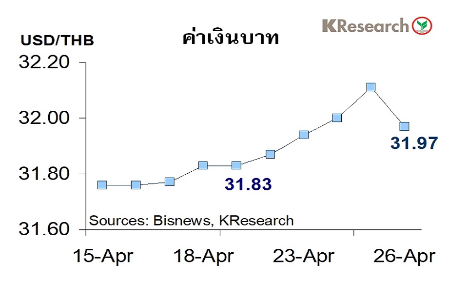 บริษัทศูนย์วิจัยกสิกรไทย จำกัด สรุปความเคลื่อนไหวของค่าเงินบาทสัปดาห์นี้ว่า เงินบาททยอยอ่อนค่าไปที่ 32.10 บาทต่อดอลลาร์ฯ ซึ่งเป็นระดับอ่อนค่าสุดในรอบเกือบ 4 เดือน ก่อนจะฟื้นตัวกลับมาบางส่วนปลายสัปดาห์ โดยการอ่อนค่าของเงินบาทสอดคล้องกับสถานะขายสุทธิพันธบัตรไทยของนักลงทุนต่างชาติ และสกุลเงินอื่นๆ ในเอเชีย ขณะที่เงินดอลลาร์ฯ มีปัจจัยบวกจากข้อมูลเศรษฐกิจสหรัฐฯ ที่ออกมาดีกว่าที่คาด ประกอบกับมีแรงหนุนเพิ่มเติม หลังเงินยูโรถูกกดดันจากสัญญาณชะลอตัวของเศรษฐกิจเยอรมนีและยูโรโซนในภาพรวม อย่างไรก็ดี เงินบาทลดช่วงอ่อนค่าและฟื้นตัวกลับมาได้เล็กน้อยในช่วงท้ายสัปดาห์ ในวันศุกร์ (26 เม.ย.) เงินบาทอยู่ที่ 31.97 บาทต่อดอลลาร์ฯ เทียบกับระดับ 31.83 บาทต่อดอลลาร์ฯ ในวันศุกร์ก่อนหน้า (19 เม.ย.)
