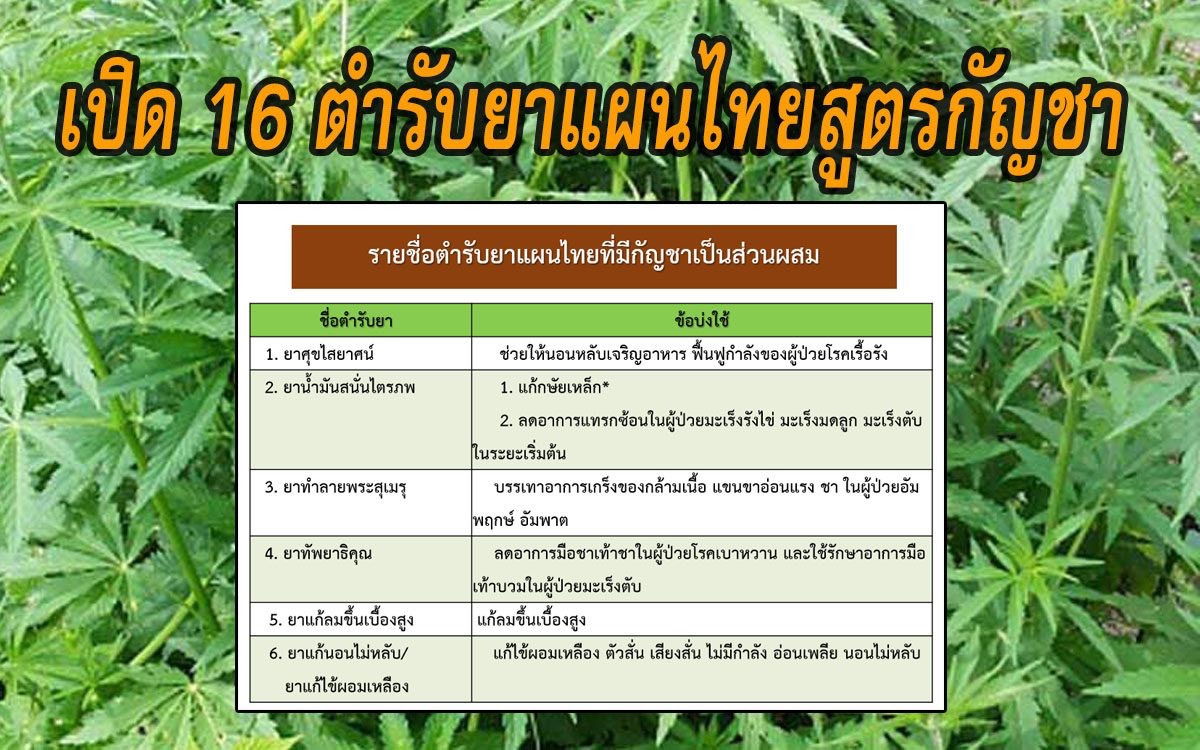 สำหรับการขับเคลื่อน ในการนำกัญชาใช้ประโยชน์ทางการแพทย์แผนไทยนั้น จะดำเนินการตามรายการยา 16 ตำรับที่ผ่าน การประกาศใช้ และมีกัญชาเป็นส่วนผสม ซึ่งมีการคัดกรองความซ้ำซ้อนจาก 200 ตำรับ เหลือ 90 ตำรับ ในจำนวนดังกล่าว มีการจัดแบ่ง ตามกลุ่มในการพัฒนาเป็นลำดับชั้น แยกเป็น 4 กลุ่ม คือ