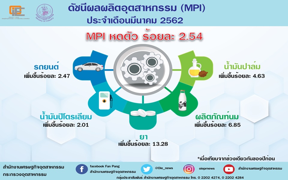 นายอิทธิชัย ยศศรี รองผู้อำนวยการสำนักงานเศรษฐกิจอุตสาหกรรม (สศอ.) เปิดเผยว่า ดัชนีผลผลิตอุตสาหกรรม (MPI) เดือนมีนาคม 2562 ยังคงแข็งแกร่ง แม้ได้รับผลกระทบจากอากาศที่ร้อนจัดที่ส่งผลให้สินค้าเกษตรซึ่งเป็นวัตถุดิบในอุตสาหกรรมแปรรูปอาหารลดลง รวมถึงการปรับลดคาดการณ์เศรษฐกิจโลกของกองทุนการเงินระหว่างประเทศ (ไอเอ็มเอฟ) เนื่องจากเศรษฐกิจโลกชะลอตัว
