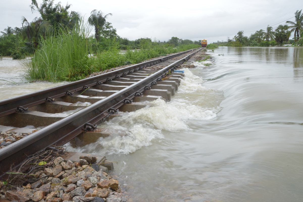 ส่วนสถานีรถไฟปากคลอง มีน้ำไหลผ่านรางรถไฟและเริ่มเซาะหินรองหมอนหายไปประมาณ 10 เมตร หัวรถจักรรถไฟต้องจอดอยู่ห่างสถานีประมาณ 500 เมตร และโบกี้โดยสารลากกลับไปจอดไว้ที่สถานีพัทลุง โดยเจ้าหน้าที่สถานีระบุว่า ขบวนรถไฟแล่นผ่านขาขึ้น-ขาล่อง 32 เที่ยว ไม่สามารถผ่านได้ รวมทั้งขบวนรถไฟจากต่างประเทศ และการซ่อมรางก็ต้องรอให้น้ำลดเป็นปกติ ดังนั้น จึงไม่สามารถกำหนดวันเดินรถได้.-สำนักข่าวไทย