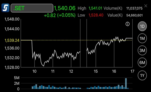 ตลท. 23 ส.ค. – ผู้สื่อข่าวรายงานว่าดัชนีปิดตลาดวันนี้ (23 ส.ค.) ที่ระดับ 1,540.06 จุด เพิ่มขึ้น 0.82 จุด หรือร้อยละ 0.05 มูลค่าการซื้อขาย 54,660.60 ล้านบาท โดยดัชนีเคลื่อนไหวแดนลบเป็นส่วนใหญ่ ขยับขึ้นแตะจุดสูงสุดของวันที่ระดับ 1,541.01 จุด และต่ำสุดของวันที่ระดับ 1,528.40 จุด