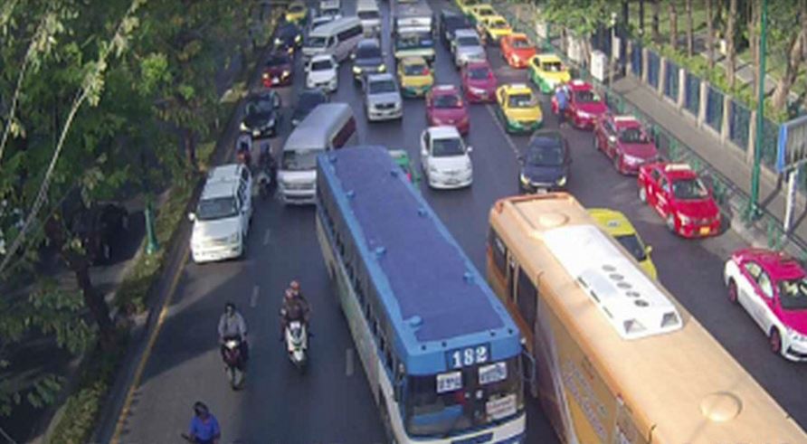 ถนนพระราม 4 ขาเข้า ผ่านใต้ด่วนพระราม 4 ต่อเนื่องเข้าแยกวิทยุ ติดขัดมาก ท้ายแถวสะสมหน้าตลาดคลองเตย