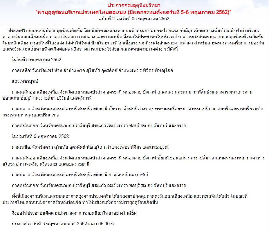 กทม. 5 พ.ค. – กรมอุตุนิยมวิทยา ประกาศเตือนพายุฤดูร้อนบริเวณประเทศไทยตอนบน (มีผลกระทบตั้งแต่วันที่ 5-6 พฤษภาคม 2562) ฉบับที่ 11 ลงวันที่ 05 พฤษภาคม 2562