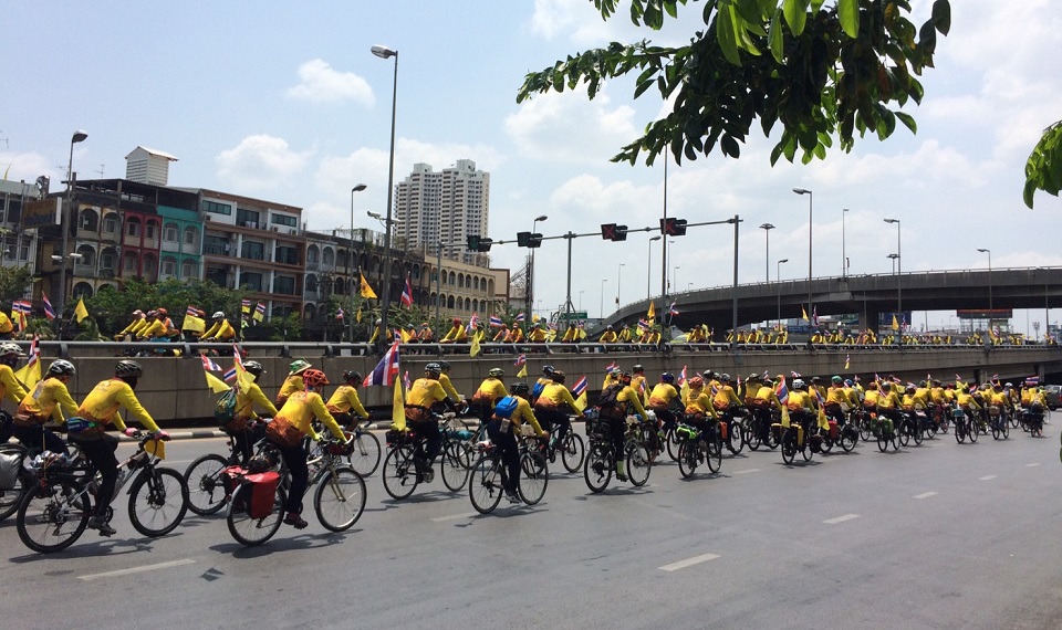 กรุงเทพฯ 6 พ.ค. – คณะปั่น 4 ภาค เทิดไท้องค์ราชัน โดยมีนักปั่นจักรยานจากหลายจังหวัดทั่วประเทศ กว่า 400 คน ร่วมปั่นจักรยานจากจังหวัดของตนเอง เช่น เชียงใหม่ นราธิวาส ยะลา เป็นต้น มารวมพลที่มหาวิทยาลัยมหิดล ศาลายา และร่วมกันปั่นต่อเนื่องบนทางคู่ขนานลอยบรมราชชนนี มาถึงเชิงสะพานพระปิ่นเกล้า(ฝั่งธนบุรี) รวมระยะทางกว่า 22 กิโลเมตร โดยมีทีมแพทย์ – พยาบาล เจ้าหน้าที่กรุงเทพมหานคร ทหารและตำรวจมารอรับและคอยดูแลอย่างใกล้ชิด