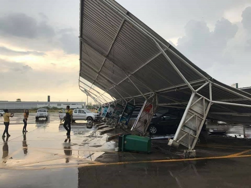 นครราชสีมา 6 พ.ค.- ฤทธิ์พายุฤดูร้อนถล่มโคราช โครงหลังคาลานจอดรถศูนย์จำหน่ายสินค้ารายใหญ่ล้มทับรถลูกค้าเกือบ 20 คัน รวมทั้งป้ายใหญ่โค่นใส่หลังคาแหล่งขายสินค้าราคาถูก เบื้องต้นไม่มีผู้บาดเจ็บ