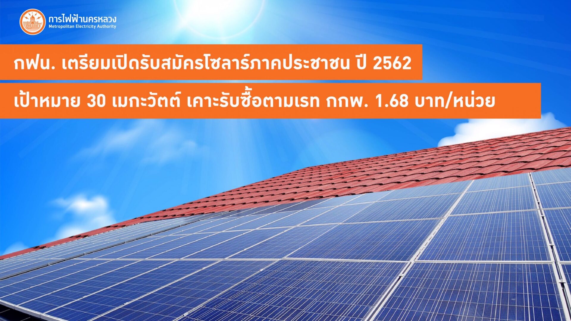 นายจาตุรงค์ สุริยาศศิน ผู้ช่วยผู้ว่าการการไฟฟ้านครหลวง (กฟน.) ในฐานะโฆษก กฟน. เปิดเผยว่า ตามที่ คณะกรรมการกำกับกิจการพลังงาน (กกพ.) ดำเนินโครงการโซลาร์ภาคประชาชน ประเภทบ้านอยู่อาศัยที่ประสงค์จะผลิตไฟฟ้าจากพลังงานแสงอาทิตย์ที่ติดตั้งบนหลังคา เพื่อใช้เองเป็นหลัก โดยส่วนที่เหลือขายเข้าระบบได้ ในปี 2562 โดยกำหนดให้การไฟฟ้าฝ่ายจำหน่าย แบ่งสัดส่วนรับซื้อ โดย การไฟฟ้านครหลวง (กฟน.) รับซื้อ 30 เมกะวัตต์ และการไฟฟ้าส่วนภูมิภาค (กฟภ.) รับซื้อ 70 เมกะวัตต์ เป็นระยะเวลาสัญญา 10 ปี ในอัตรารับซื้อไฟฟ้าอยู่ที่ 1.68 บาท/หน่วย ในรูปแบบการพิจารณายึดถือวันและเวลาที่ได้รับแบบคำขอขายไฟฟ้าและเอกสารประกอบการพิจารณาที่ครบถ้วนถูกต้อง (First come First served) นั้น ผู้สมัคร ต้องเป็นผู้ที่มีเครื่องวัดหน่วยไฟฟ้าประเภทที่ 1 ตามประกาศอัตราค่าไฟฟ้าของการไฟฟ้าฝ่ายจำหน่ายไม่เกิน 10 KW ต่อครัวเรือน