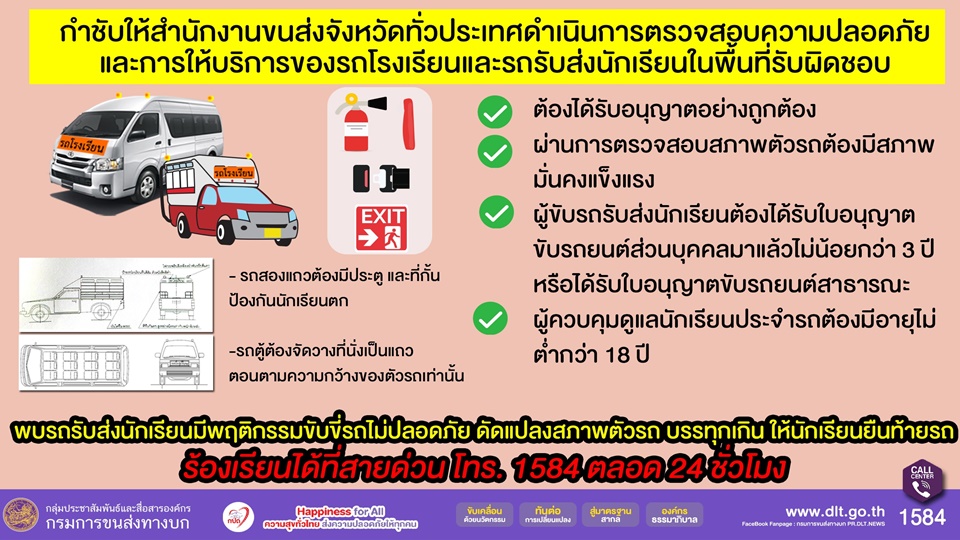ด้านผู้ขับรถรับส่งนักเรียนต้องได้รับใบอนุญาตขับรถยนต์ส่วนบุคคลมาแล้วไม่น้อยกว่า 3 ปี หรือได้รับใบอนุญาตขับรถยนต์สาธารณะ หรือเป็นผู้ขับรถตามกฎหมายว่าด้วยการขนส่งทางบก ซึ่งต้องไม่เคยมีประวัติเสียหายจากการขับรถมาก่อน และต้องมีผู้ควบคุมดูแลนักเรียนประจำรถ ซึ่งมีอายุไม่ต่ำกว่า 18 ปี ประจำอยู่ในรถตลอดเวลาที่ใช้รับส่งนักเรียน และต้องปฏิบัติตามกฎกระทรวงและกฎหมายจราจรอย่างเข้มงวด หากพบรถรับส่งนักเรียนมีการดัดแปลงสภาพตัวรถหรือสภาพรถไม่ปลอดภัย บรรทุกผู้โดยสารเกิน ปล่อยให้นักเรียนยืนท้ายรถ หรือผู้ขับรถมีพฤติกรรมขับขี่ไม่ปลอดภัย ร้องเรียนได้ที่สายด่วน โทร. 1584 ตลอด 24 ชั่วโมง.-สำนักข่าวไทย