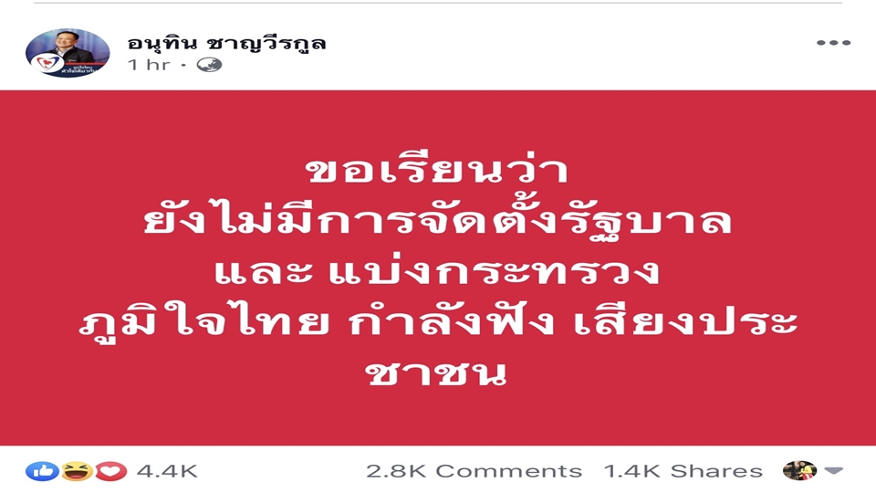 นายอนุทิน ชาญวีรกูล หัวหน้าพรรคภูมิใจไทย เฟสบุ๊คส่วนตัว “อนุทิน ชาญวีรกูล” โพสต์ข้อความถึงกระแสข่าวไปจัดตั้งรัฐบาลกับพรรคพลังประชารัฐใจความว่า ขอเรียนว่ายังไม่มีการจัดตั้งรัฐบาลและแบ่งกระทรวง พรรคภูมิใจไทยกำลังฟังเสียงประชาชา