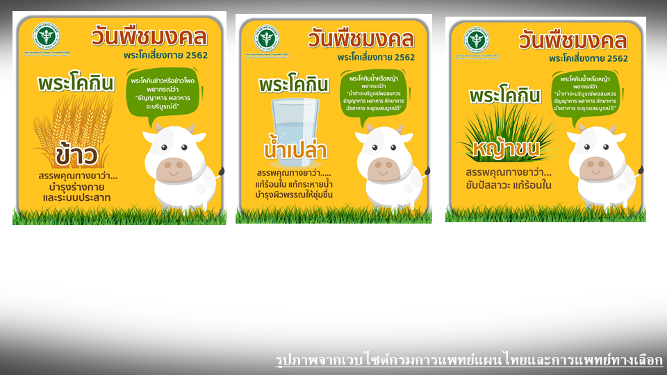 วันนี้ (9พ.ค.) เวบไซต์ของกรมการแพทย์แผนไทยและการแพทย์ทางเลือก กระทรวงสาธารณสุข www.dtam.moph.go.th จัดทำอินโฟกราฟฟิกพระโคเสี่ยงทาย 2562 ในพระราชพิธีพืชมงคลจรดพระนังคลังแรกนาขวัญ ซึ่งได้เลือกกินข้าว น้ำ และหญ้า ในจำนวนของเสี่ยงทายทั้งหมด โดยของเสี่ยงทายที่พระโคเลือกกินนั้น ล้วนแต่มีสรรพคุณทางยาทั้งสิ้น
