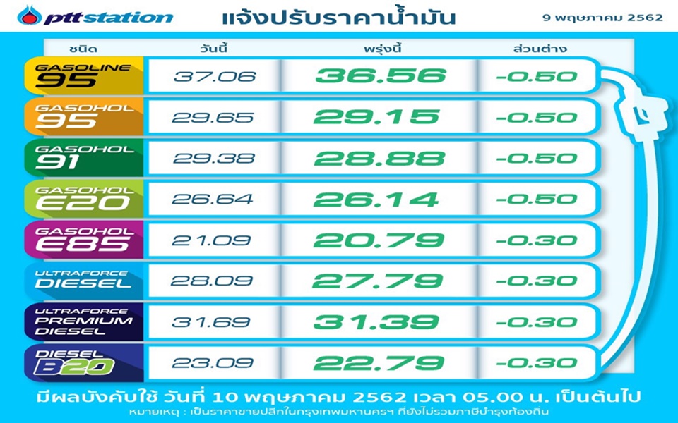 ปตท.-บางจากฯ ปรับราคาขายปลีกน้ำมันกลุ่มเบนซินและแก๊สโซฮอลล์ทุกชนิดลง 50 สตางค์ต่อลิตร ยกเว้น E85 ลดลง 30 สตางค์ต่อลิตร ส่วนดีเซล ดีเซลพรีเมี่ยม และ B20 ลดลง 30 สตางค์ต่อลิตร มีผล 10 พฤษภาคม 2562 เวลา 05.00 น. เป็นต้นไป โดยราคาขายปลีกจะเป็นดังนี้ เบนซิน 95 ลิตรละ 36.56 บาท แก๊สโซฮอล์ 95 ลิตรละ 29.15 บาท E20 ลิตรละ 26.14 บาท แก๊สโซฮอล์ 91 ลิตรละ 28.88 บาท E85 ลิตรละ 20.79 บาท ดีเซล 27.79 บาท ดีเซลพรีเมี่ยม 31.39 บาท และ B20 ลิตรละ 22.79 บาท โดยราคาขายปลีกข้างต้นยังไม่รวมภาษีบำรุงกรุงเทพมหานคร.-สำนักข่าวไทย