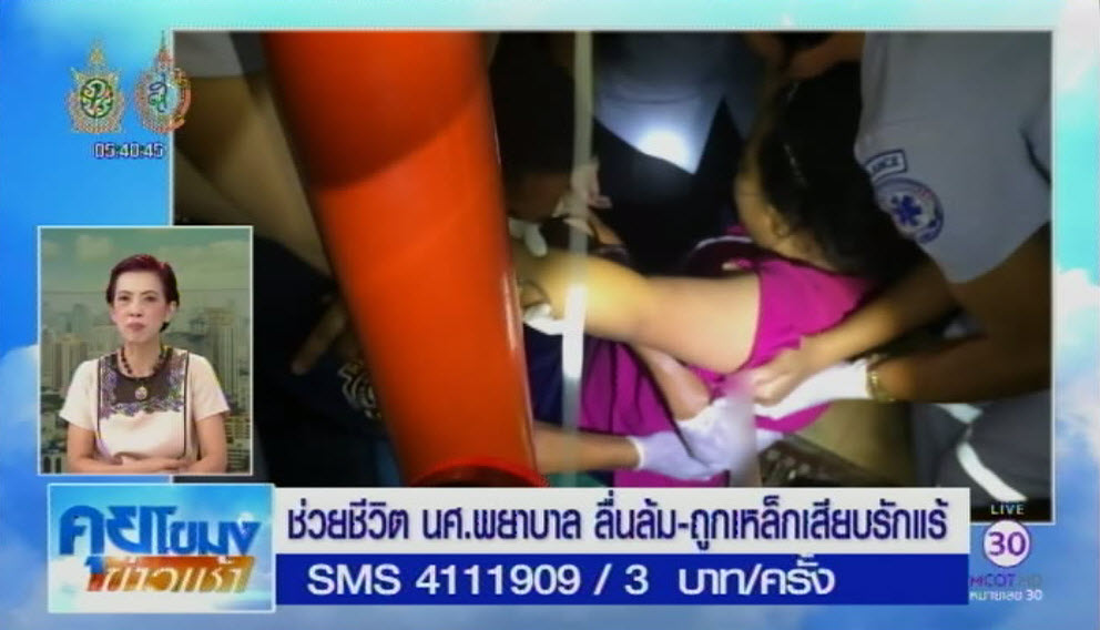 นี่คือภาพเหตุการณ์ขณะเจ้าหน้าที่กู้ภัยใช้คีมตัดเหล็ก เพื่อช่วยชีวิตน้องฟาง นักศึกษาวิทยาลัยพยาบาลบรมราชชนนีสุราษฎร์ธานี ปี 2 ที่ประสบอุบัติเหตุ ลื่นล้มถูกเหล็กแทงเข้าที่ใต้รักแร้ อาการสาหัส หลังใช้เวลาประมาณ 20 นาที จึงสามารถตัดเหล็กออกได้ และนำตัวส่งโรงพยาบาลสุราษฎร์ธานี เพื่อช่วยชีวิต ท่ามกลางความตกใจของนักศึกษาร่วมสถาบันกว่า 100 คน ที่กำลังจัดกิจกรรมรับน้องใหม่