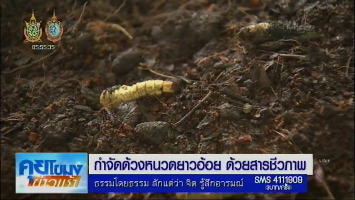 ศูนย์ส่งเสริมเทคโนโลยีการเกษตรด้านอารักขาพืชสาธิตการฉีดพ่นเชื้อราที่มีคุณสมบัติกำจัดด้วงหนวดยาวอ้อย อ้อยสำหรับผลิตน้ำตาลเป็นพืชเศรษฐกิจสำคัญของจังหวัดภาคกลางฝั่งตะวันตก พื้นที่ปลูกประมาณ 1.8 ล้านไร่ ได้ผลผลิตปีละ 11 ล้านตัน แต่ปีที่ผ่านมาเกิดภัยแล้งยาวนาน ทำให้มีปัญหาการระบาดของด้วงหนวดยาวด้อยถึง 1.6 แสนไร่ โดยเฉพาะพื้นที่ที่เป็นดินปนทรายธาตุอาหารต่ำ ด้วงช่วงวัยตัวหนอนจะเริ่มเข้าทำลายตั้งแต่ระยะท่อนพันธุ์ โดยเจาะเข้าไปกัดกินเนื้ออ้อยทำให้ดต้นพันธุ์ไม่งอก หากเช้ากัดกินอ้อยที่โตขึ้นเป็นลำแล้ว จะทำให้ผลผลิตอ้อยลดลงร้อยละ 10-40 เช่นเดียวกับผลผลิตน้ำตาล