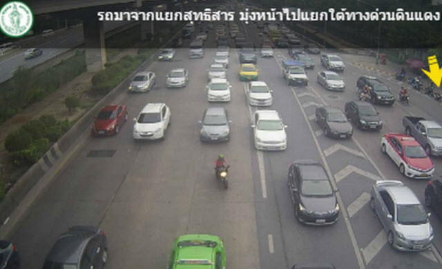 สภาพการจราจร ถนนวิภาวดีรังสิต ขาเข้า จาก แยกสุทธิสาร มุ่งหน้า แยกใต้ด่วนดินแดง รถหนาแน่นติดขัดสลับหยุด ท้ายสะสมแยกสุทธิสาร ที่แยกใต้ด่วนดินแดงเลี้ยวขวาไปอนุสาวรีย์ชัยฯ รถติด