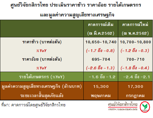 ศูนย์วิจัยกสิกรไทย ได้ปรับคาดการณ์สถานการณ์ภัยแล้งในปี 2562 ว่าหากลากยาวต่อเนื่องออกไปอีก 2 เดือนข้างหน้า คือราวเดือนก.ค. จากที่จะยุติในเดือนพ.ค. โดยผลกระทบก็น่าจะอยู่ในวงจำกัด เนื่องจากยังไม่ถึงฤดูกาลเพาะปลูกพืชสำคัญอย่างข้าวนาปี รวมถึงระดับความรุนแรงของภัยแล้งน่าจะลดน้อยลงกว่าในช่วงรุนแรงที่สุดในเดือนมี.ค.-เม.ย. ผนวกกับฝนที่อาจมีมาบ้าง แม้ว่าจะยังเป็นภาวะฝนทิ้งช่วงในเดือนก.ค.-มิ.ย. ทำให้ในภาพรวมแล้วสภาพอากาศต่อจากนี้ในอีก 2 เดือนข้างหน้าจะนับว่ายังคงแห้งแล้ง ซึ่งแม้ผลจากภัยแล้งจะช่วยดันราคาข้าวและอ้อยให้ขยับขึ้นได้ แต่อย่างไรก็ตาม จะยิ่งเป็นการซ้ำเติมรายได้เกษตรกรที่เดิมก็แย่อยู่แล้วให้เผชิญความยากลำบากเพิ่มขึ้นไปอีก นอกจากนี้ ยังส่งผลกระทบต่อมูลค่าความสูญเสียทางเศรษฐกิจที่อาจเพิ่มขึ้นอีกราวเดือนละ 1,000 ล้านบาท จนอาจประเมินได้ว่า หากภัยแล้งลากยาวไปจนถึงเดือนก.ค.2562 ก็อาจทำให้เกิดมูลค่าความสูญเสียทางเศรษฐกิจรวมที่ราว 17,300 ล้านบาท
