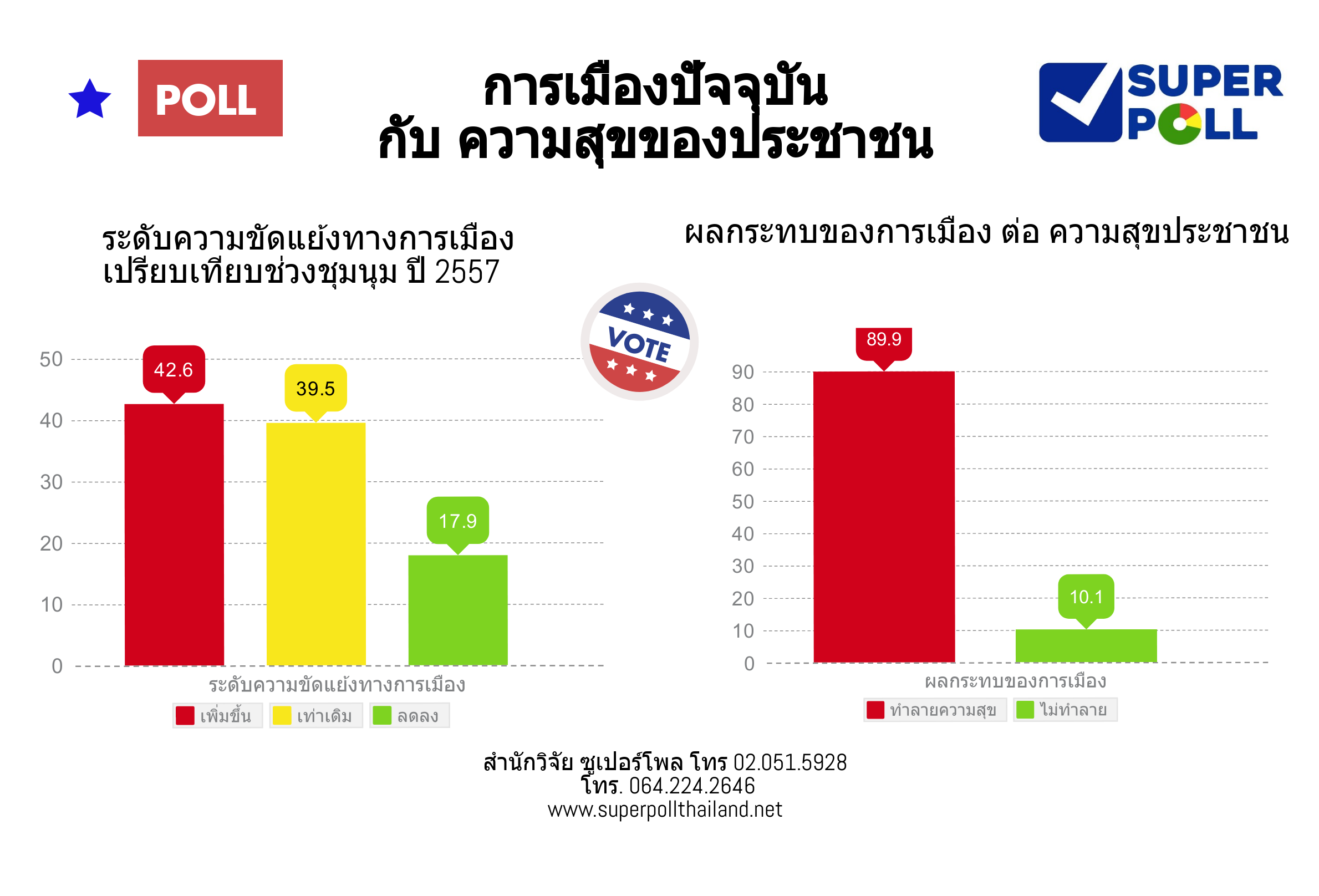ซูเปอร์โพล12 พ.ค..-สำนักวิจัย ซูเปอร์โพล นำเสนอผลสำรวจภาคสนาม เรื่อง การเมืองปัจจุบัน กับ ความสุขของประชาชน พบว่าส่วนใหญ่หรือร้อยละ 89.9 ระบุ การเมืองปัจจุบันส่งผลกระทบทำลายความสุขของประชาชน