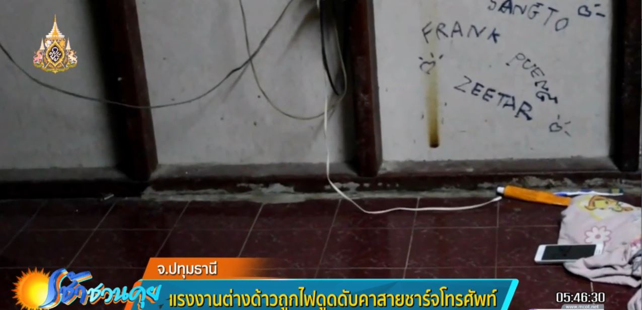 ปทุมธานี 13 พ.ค. – หนุ่มโรงน้ำแข็งชาวลาววัย 43 ปี ถูกไฟดูดหน้าคว่ำทับสายชาร์จโทรศัพท์ เสียชีวิตในห้องเช่าตึกแถวตลาดรังสิต ต.ประชาธิปัตย์ อ.ธัญบุรี จ.ปทุมธานี