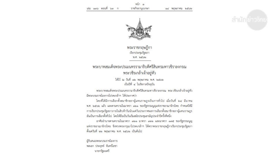 อาศัยอำนาจตามความในมาตรา 121 มาตรา 122 และมาตรา 175 ของรัฐธรรมนูญแห่งราชอาณาจักรไทย จึงทรงพระกรุณาโปรดเกล้าฯ ให้ตราพระราชกฤษฎีกาเรียกประชุมรัฐสภา ตั้งแต่วันที่ 22 พฤษภาคม พ.ศ. 2562 เป็นต้นไป ..- สำนักข่าวไทย