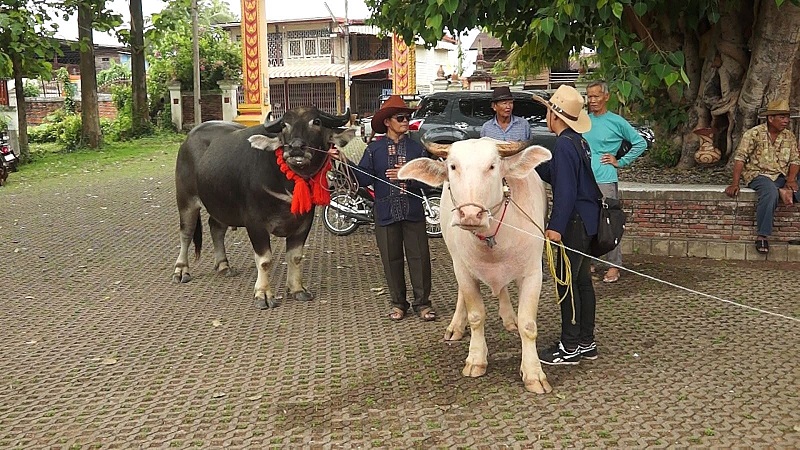 วันนี้ (14 พ.ค.) ที่วัดโพธิ์ศรีใน ต.บ้านเชียง อ.หนองหาน จ.อุดรธานี นายทศพร ศรีศักดิ์ นายกสมาคมอนุรักษ์และพัฒนาควายไทย นำเกษตรกรผู้เลี้ยงควาย ร่วมทำบุญอุทิศส่วนกุศลแก่ควายที่ล้มตาย และทำพิธีบายศรีสู่ขวัญควายเลี้ยงของเกษตรกร เนื่องในวันอนุรักษ์ควายไทย 14 พ.ค. จากนั้นเข้าเยี่ยมชมหลุมขุดค้นโบราณคดี ซึ่งขุดพบโครงกระดูกบรรพบุรุษควาย สมัยบ้านเชียงอายุ 2,300 ปีก่อนประวัติศาสตร์ ถูกฝังไปพร้อมกับศพมนุษย์