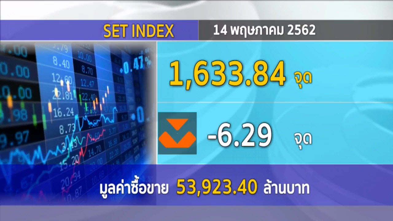 กรุงเทพฯ 14 พ.ค.–หุ้นไทยลบ 6.29 จุด ทิศทางเดียวกับตลาดภูมิภาค กังวลสงครามการค้า-แรงกดดันผลประกอบการต่ำคาด ดัชนีตลาดหลักทรัพย์ฯ ปิดที่ระดับ 1,633.84 จุด ลดลง 6.29 จุด หรือ 0.38 มูลค่าการซื้อขาย 53,923.40 ล้านบาท  โดยวันนี้ (14 พ.ค.) ดัชนีเคลื่อนไหวแดนลบตลอดทั้งวัน ดัชนีฯแตะจุดสูงสุดที่ 1,639.63 จุด และต่ำสุดที่ระดับ 1,629.56 จุด.-สำนักข่าวไทย