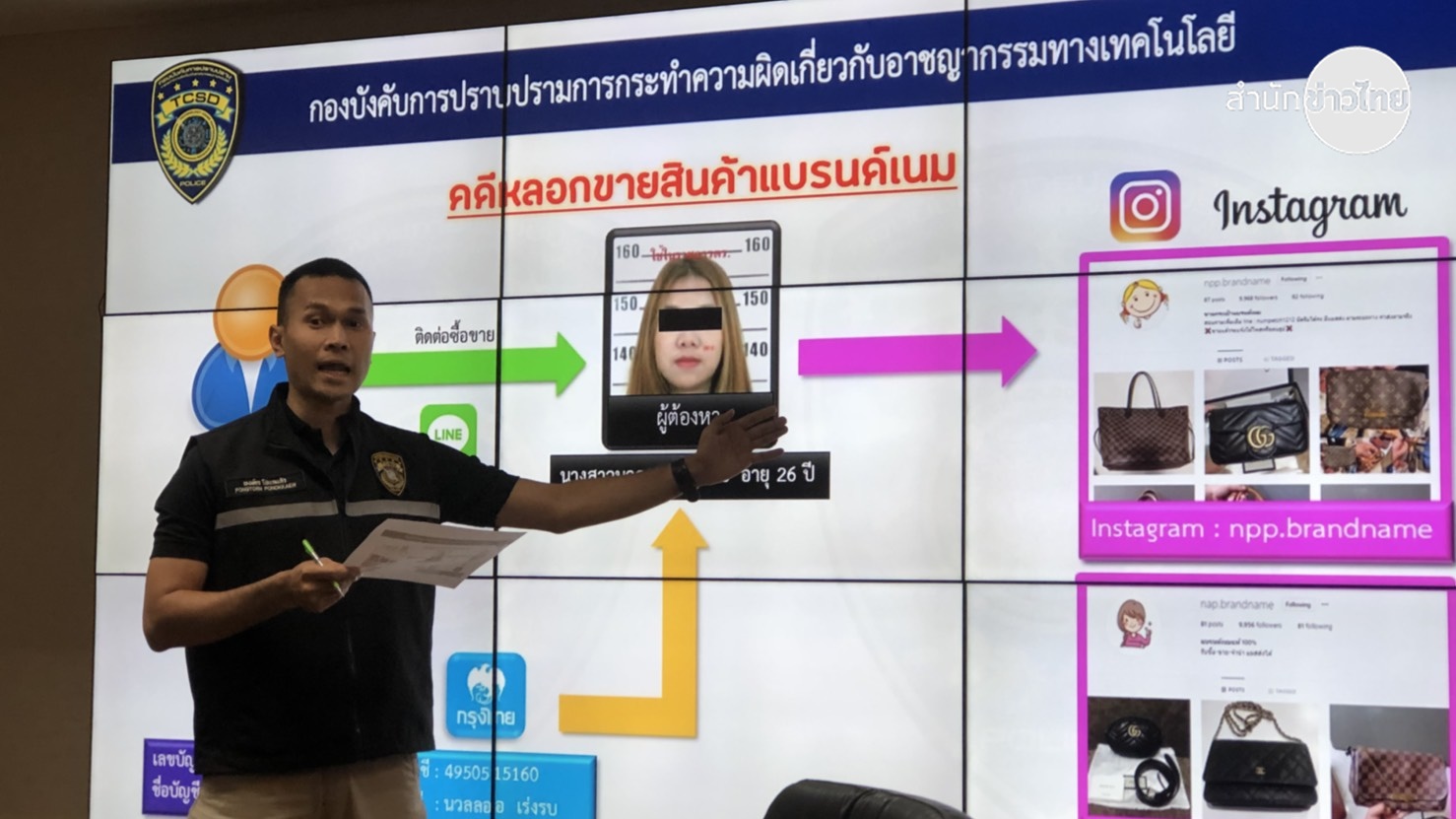 พันตำรวจเอกศิริวัฒน์ ดีพอ ในฐานะโฆษกกองบังคับการปราบปรามการกระทำความผิดเกี่ยวกับอาชญากรรมทางเทคโนโลยี หรือ ปอท.แถลงจับกุมนางสาวนวลลออ เร่งรบ หลังเปิดอินสตาแกรม ชื่อ npp.brandname , petch.brandname มีผู้ตามกว่า 10,000 คน มีการโพสต์สินค้าแบรนด์เนม 79 ภาพ โดยใช้ไลน์ numpetch เป็นช่องทางติดต่อซื้อขายสินค้า