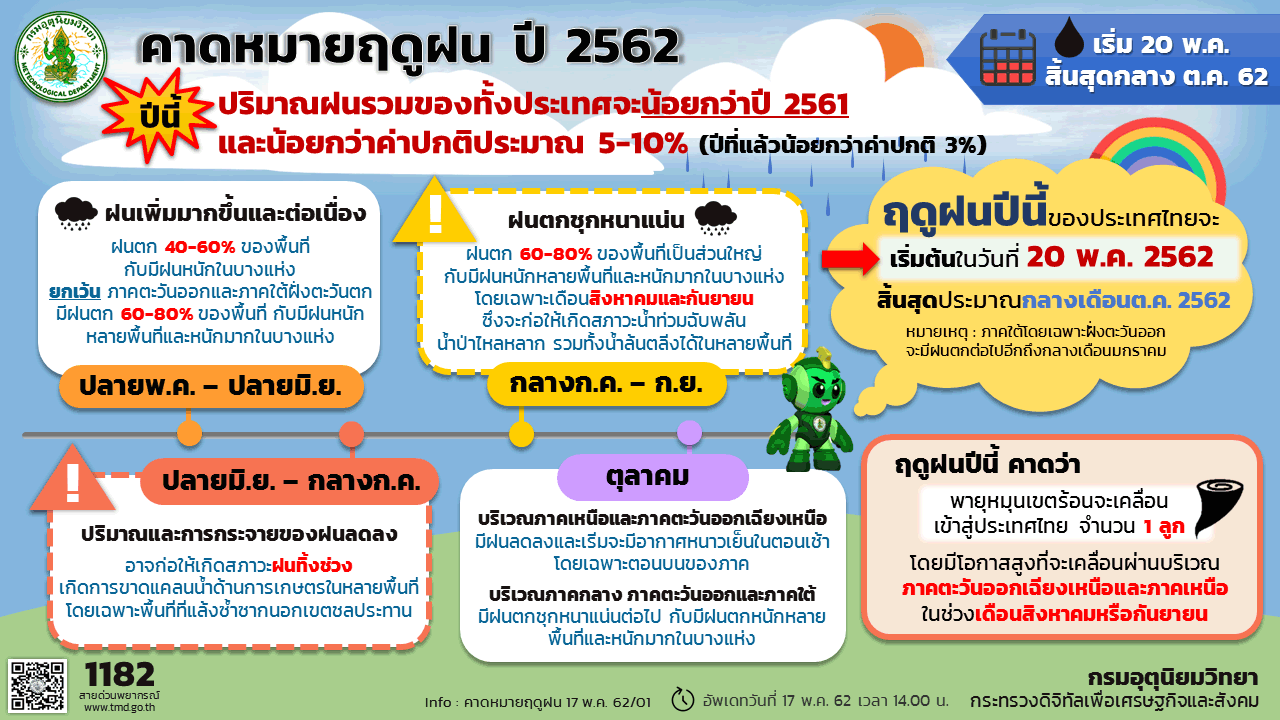 สำหรับฤดูฝนของประเทศไทยในปีนี้ จะเริ่มขึ้นในวันที่ 20 พ.ค.62 เนื่องจากประเทศไทยจะมีฝนตกชุกต่อเนื่องและเพิ่มพื้นที่มากขึ้นครอบคลุมพื้นที่ส่วนใหญ่ของประเทศ ประกอบกับลมที่พัดปกคลุมประเทศไทยในระดับล่างที่ความสูงประมาณ 100 เมตร ถึงประมาณ 3,500 เมตร ได้เปลี่ยนเป็นลมตะวันตกเฉียงใต้ ซึ่งพัดพาความชื้นจากทะเลอันดามันเข้าปกคลุมประเทศไทยอย่างต่อเนื่อง ส่วนลมระดับบนที่ความสูงประมาณ 5,000 เมตรขึ้นไป ได้เปลี่ยนเป็นลมฝ่ายตะวันออก ซึ่งถือว่าเป็นการเข้าสู่ฤดูฝนของประเทศไทยในปีนี้