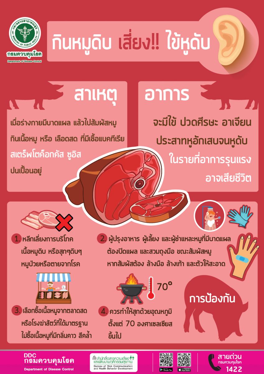 สธ. 19 พ.ค..- กระทรวงสาธารณสุขห่วงประชาชนบริโภคแหนมหมู หมูดิบ เสี่ยงโรคไข้หูดับ อาจเสียชีวิตได้ ให้สาธารณสุขจังหวัดเร่งลงพื้นที่สอบสวนโรค แนะให้ปรุงเนื้อหมูให้สุกด้วยความร้อนจนเนื้อไม่มีสีแดง