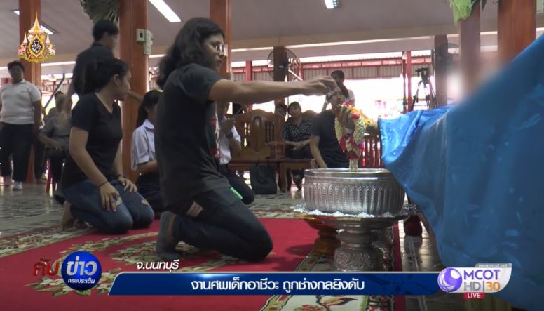 โดยพิธีรดน้ำศพ มีบรรดาญาติของผู้เสียชีวิต พร้อมทั้งกลุ่มเพื่อน ทยอยมาร่วมพิธีอย่างต่อเนื่อง ขณะที่นางสุดใจ อินทะศร อายุ 39 ปี มารดาของผู้เสียชีวิตยังอยู่ในอาการโศกเศร้า บรรดาเพื่อนและญาติต้องคอยเฝ้าปลอบใจ