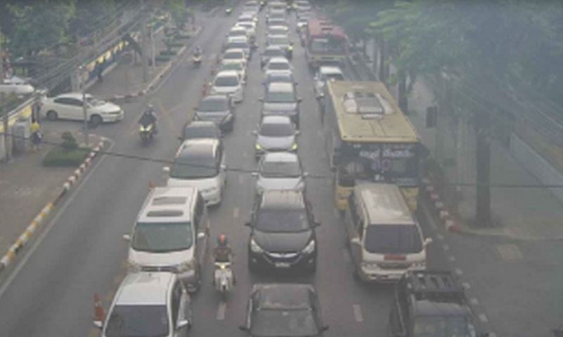 ถนนสามเสน ขาเข้า มุ่งหน้าแยกซังฮี้ ติดขัดมาก ท้ายแถวสะสมอยู่ที่แยกเกียกกาย