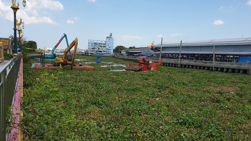สภาพคลองมหาชัย อ.เมือง จ.สมุทรสาคร เต็มแน่นไปด้วยผักตบชวามาตลอด 1 สัปดาห์แล้ว เจ้าหน้าที่หลายหน่วยงานเร่งใช้เครื่องจักรกลจัดเก็บผักตบชวา มีทั้งรถแบ็คโฮยืนโป๊ะจาก อบจ.สมุทรสาคร รวมทั้งรถแบ็คโฮและเรือผลักดันจากกรมโยธาธิการและผังเมือง นำผักตบชวาขึ้นมากองไว้บนลานหน้าวัดตึกมหาชัย ต.มหาชัย อ.เมืองส กลายเป็นกองสูงใหญ่ เพื่อรอให้รถบรรทุกนำไปทิ้งในพื้นที่ 19 ไร่ ของเทศบาลนครสมุทรสาคร แม้เจ้าหน้าที่จะเร่งกำจัด แต่ผักตบชวาก็ยังคงไหลเข้าสู่คลองมหาชัยตลอดเวลา โดยเฉพาะช่วงน้ำทะเลหนุนขึ้นมา