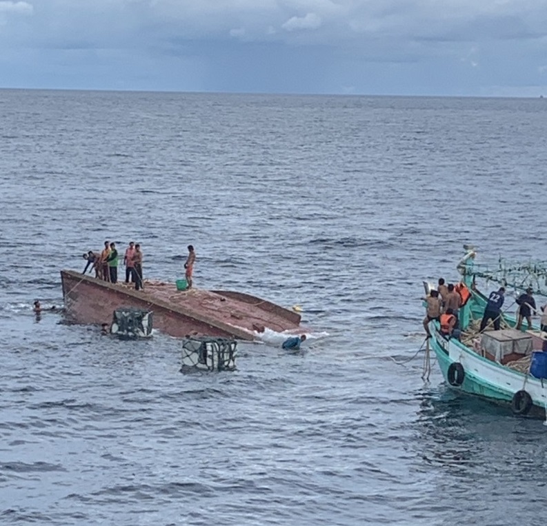 สำหรับเรือประมงลำดังกล่าวออกทะเลเมื่อเย็นวานนี้ (25 พ.ค.) ขณะเดินทางกลับเข้าฝั่งประสบกับฝนตกหนักคลื่นลมแรง ทำให้เรือพลิกคว่ำและอุปกรณ์หาปลาจมทะเลทั้งหมด