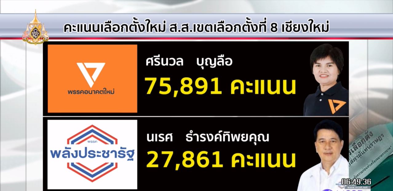 เชียงใหม่ 27 พ.ค.-การเลือกตั้งใหม่ ส.ส.เขต 8 จ.เชียงใหม่ เป็นไปอย่างคึกคัก โดยผลรวมคะแนนนับทุกหน่วยเลือกตั้ง ผลปรากฏว่า “ศรีนวล บุญลือ” ผู้สมัครจากพรรคอนาคตใหม่ ได้คะแนนเสียง 75,891 คะแนน ชนะขาดลอย “นเรศ ธำรงค์ทิพยคุณ” จากพรรคพลังประชารัฐ ที่ได้ 27,861 คะแนน
