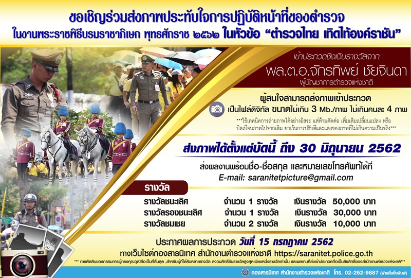 กรุงเทพฯ 27 พ.ค.- ตร. เชิญ ปชช. ส่งภาพประกวดความประทับใจการทำงานของเจ้าหน้าที่ตำรวจในงานพระราชพิธีบรมราชภิเษก ชิงเงินรางวัลจาก ผบ.ตร.
