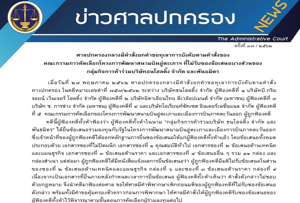 ศาลปกครองกลางมีคำสั่งยกคำขอทุเลาการบังคับตามคำสั่งทางปกครอง ในคดีที่บริษัท ธนโฮลดิ้ง จำกัด บริษัท บี.กริม จอยน์ เว็นเจอร์ โฮลดิ้ง จำกัด บริษัท อิตาเลียนไทย ดีเวล๊อปเมนต์ จำกัด (มหาชน) บริษัท ช. การช่าง จำกัด (มหาชน) และบริษัทโอเรียนท์ซัคเซส อินเตอร์เนชั่นแนล จำกัด ผู้ฟ้องคดีที่ 1- 5 ฟ้องคณะกรรมการคัดเลือกของโครงการพัฒนาสนามบินอู่ตะเภาและเมืองการบินภาคตะวันออก กรณีมีมติไม่รับข้อเสนอในส่วนของซองที่ 2 ข้อเสนอด้านเทคนิคและแผนธุรกิจ กล่องที่ 6 และซองที่ 3 ข้อเสนอด้านราคา กล่องที่ 9 เนื่องจากเป็นเอกสารที่ยื่นภายหลังกำหนดเวลาการยื่นข้อเสนอ จึงเห็นว่าคำสั่งดังกล่าวไม่ชอบด้วยกฎหมาย จึงนำคดีมาฟ้องต่อศาล ขอให้ศาลมีคำพิพากษาเพิกถอนมติของคณะกรรมการคัดเลือกฯ ที่ไม่รับซองข้อเสนอดังกล่าว พร้อมทั้งมีคำขอคุ้มครองชั่วคราวก่อนการพิพากษา ให้ศาลมีคำสั่งให้คณะกรรมการคัดเลือกฯ รับซองข้อเสนอของ 5 บริษัทไว้พิจารณาตามขั้นตอนการคัดเลือกผู้ร่วมลงทุนต่อไป