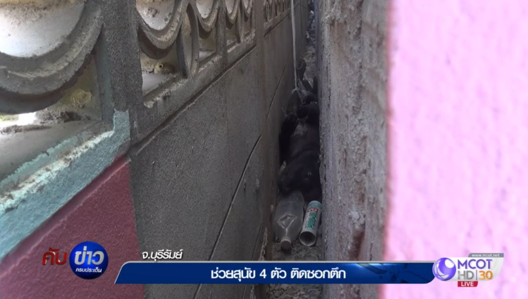 บุรีรัมย์ 28 พ.ค.-กู้ภัยช่วยสุนัข 4 ตัว ติดซอกตึกร้องโหยหวน คาดมีคนนำมาทิ้ง เจ้าหน้าที่ถูกกัด 1 ราย เร่งส่ง รพ. ฉีดยาป้องกันพิษสุนัขบ้า