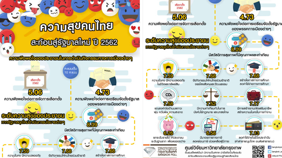 กรุงเทพโพลล์ โดยศูนย์วิจัยมหาวิทยาลัยกรุงเทพ สำรวจความคิดเห็นประชาชนเรื่อง “ความสุขคนไทย….สะท้อนสู่รัฐบาลใหม่ ปี 2562” เก็บข้อมูลประชาชนจากทุกภูมิภาคทั่วประเทศจำนวน 1,186 คนพบว่า จากคะแนนเต็ม 10 คนไทยให้คะแนนความพึงพอใจต่อการดำเนินการจัดการเลือกตั้ง 2562 ที่ผ่านมา 5.06 คะแนน ขณะที่ ให้คะแนนความพึงพอใจต่อการเตรียมจัดตั้งรัฐบาลของพรรคการเมืองต่างๆ (เปิดประชุมสภาฯ การจัดตั้งรัฐบาล/ฝ่ายค้าน) 4.73 คะแนน